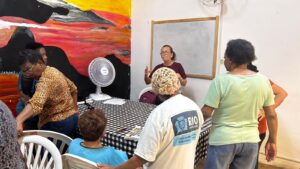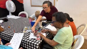 A professora Cláudia Calixto conduziu uma atividade de mímica e atividades de escrita e conhecimentos com os participantes.