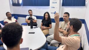 O professor, Marcos Paulo, conduziu a aula, orientou os internos e discutiu casos em medicina de família, saúde mental e saúde coletiva.