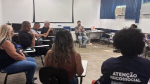 O educador Davi Depret conduziu o encontro, que atualizou profissionais dos Rede de Atenção Psicossocial (RAPS) e dos sistemas prisional e socioeducativo, fortalecendo a rede de atenção e cuidado.