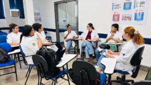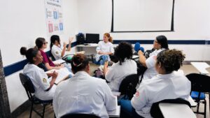 A aula contou com uma roda de conversa mediada pelas Agentes Comunitárias de Saúde (ACS) Norma Sueli, da Equipe Girassol, e Nívea Conceição, da Equipe Ary Barroso. As profissionais compartilharam suas vivências e reforçaram a importância do ACS na Atenção Básica. Durante o diálogo, destacaram a escuta ativa, a visita domiciliar e o vínculo com a comunidade como pilares da atuação no território. Essa troca de saberes fortaleceu o compromisso dos alunos com uma enfermagem humanizada e conectada às necessidades locais.