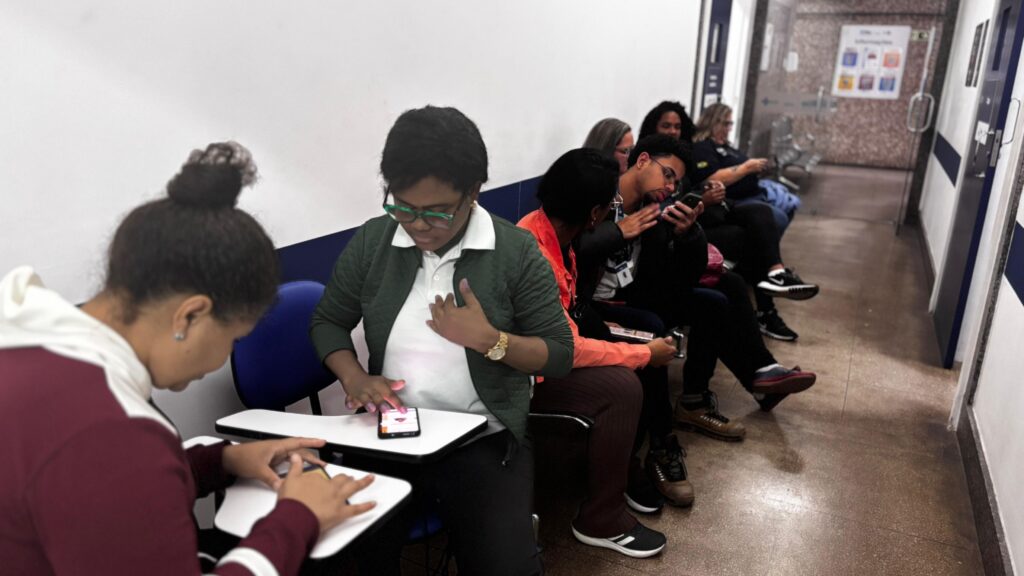 Nesta segunda-feira, 11 de agosto de 2025, no auditório da Otics-Rio Penha, acontece a avaliação dos alunos da aula de Libras. A professora Viviane Pinheiro,