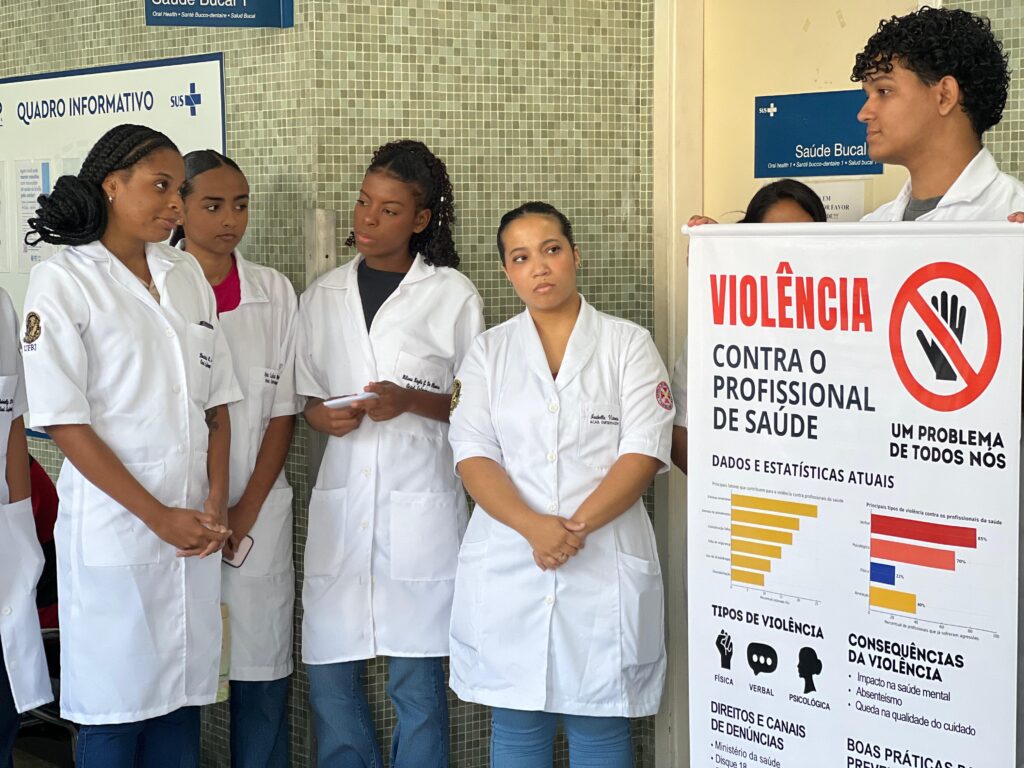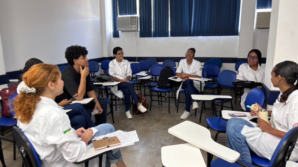 As preceptoras Larissa Dantas e Vanessa Cavalcante, da UFRJ, reuniram os alunos para a aula de Práticas e Cuidados de Enfermagem II (PCE II). A